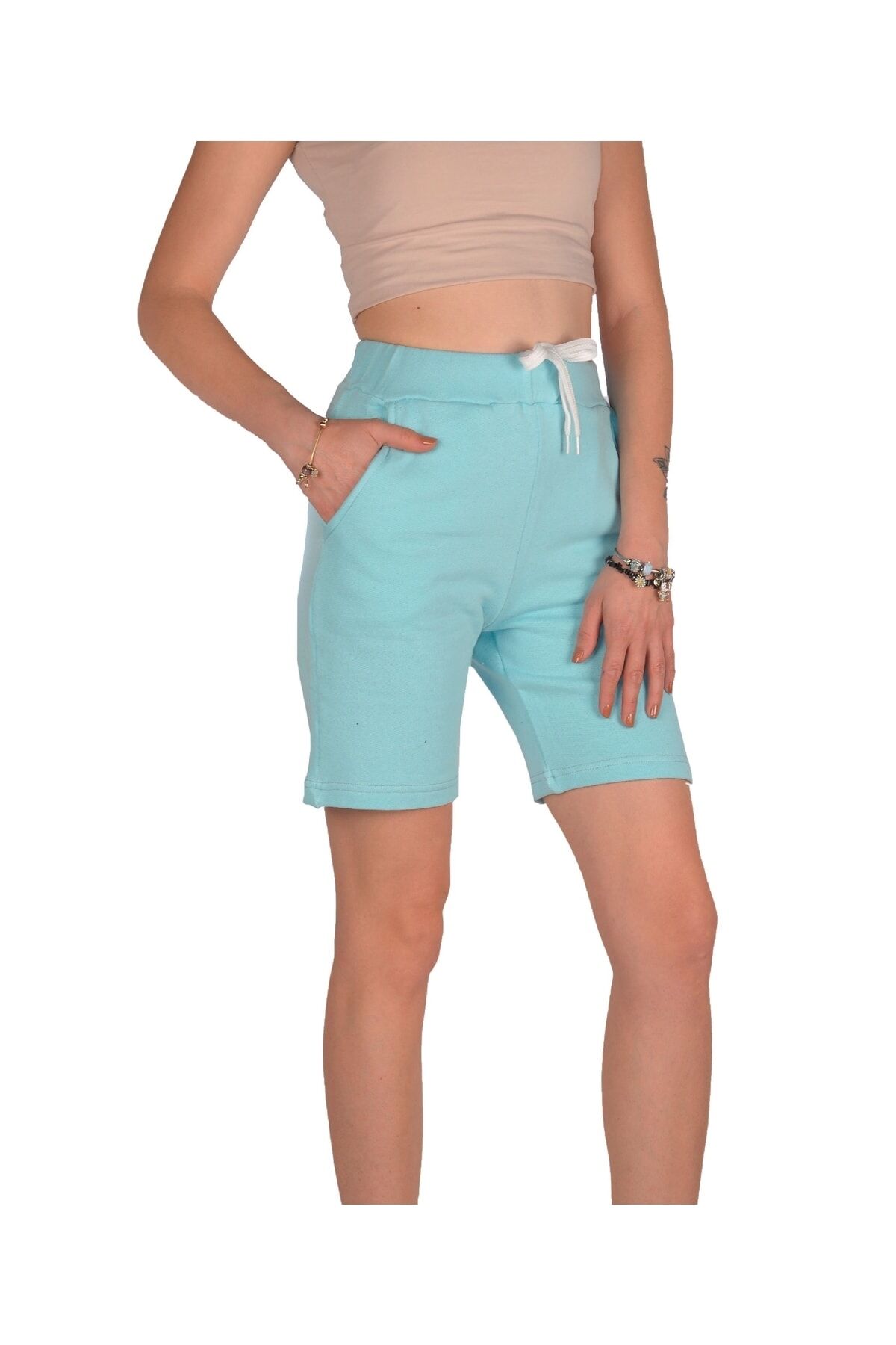 Rahat kalıbıyla gün boyu konfor sunan Bebemavisi kadın şortu, tüm yaş gruplarına hitap eden tasarımıyla dikkat çeker.; Lastikli kapama özelliği sayesinde pratik kullanım sağlar ve kolayca giyilip çıkarılabilir.; Atlet-şort kombinleri için mükemmel uyum sağlayan bu şort, kordonlu bel tasarımı ile kişisel zevkinize göre ayarlama imkanı tanır.; Trekking gibi açık hava aktivitelerinde de tercih edebileceğiniz wire siluetiyle hareket özgürlüğünüz sınırlarını zorlar.; Örme kumaş tipi, dayanıklılığı artırarak uzun süreli kullanım vaat ederken çift cepli tasarımı küçük eşyalarınız için pratik saklama alanları sunar.; Pike dokuma tipi ise şık görünümüyle tarzınıza modern bir dokunuş ekler.; Düz deseniyle zamansız bir stil sunarken, bebe mavisi rengiyle göz alıcı bir renk seçeneği olarak gardrobunuzda yerini alır.; Kemer detaylı bel kesimi sayesinde vücut hatlarınıza uygun şekilde otururken aynı zamanda spor şıklığınızı tamamlar.; Yıkamalı detayları ile bakımının kolay olduğu bu şort, günlük kullanım için idealdir.; Midi boyu sayesinde hem rahat hareket etme özgürlüğü sağlar hem de şık duruşuyla dikkat çeker.; Esnek yapısı sayesinde gün içindeki hareketlerinizde size eşlik ederken organik pamukla hazırlanan sürdürülebilirlik detaylarıyla çevreye duyarlı tercihler yapmanız mümkün olur.;