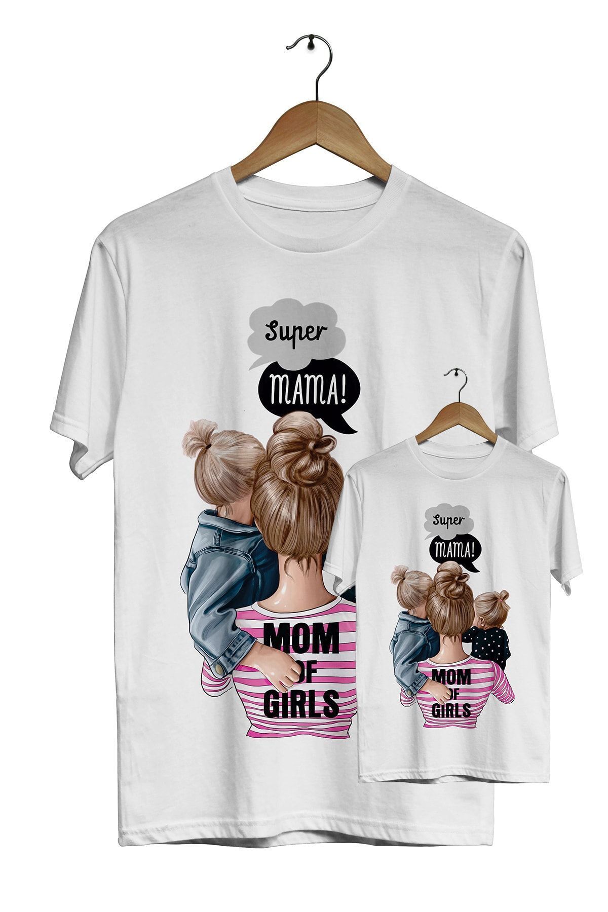 Unisex Anne ve Çocuk Beyaz Super Mama Mom Of Girls Dijital Baskılı T-Shirt